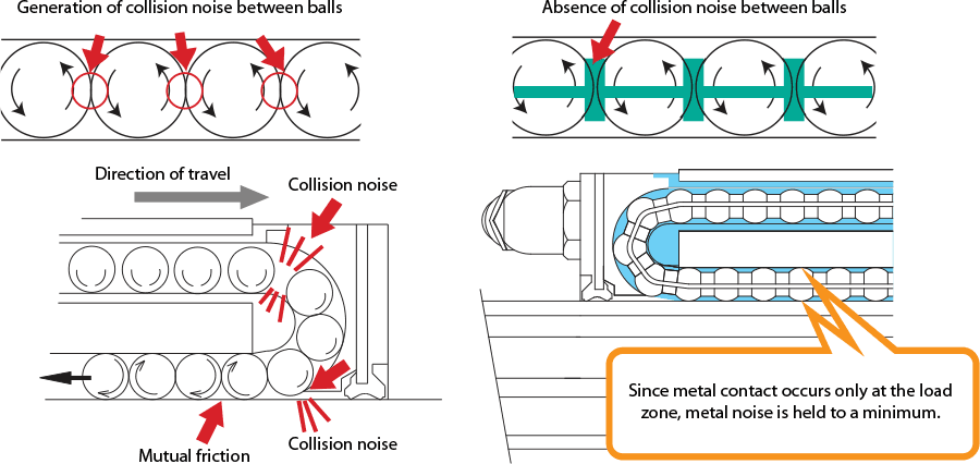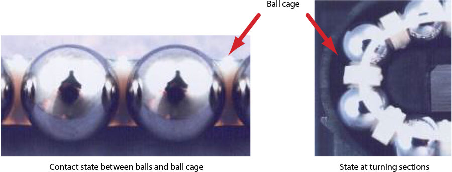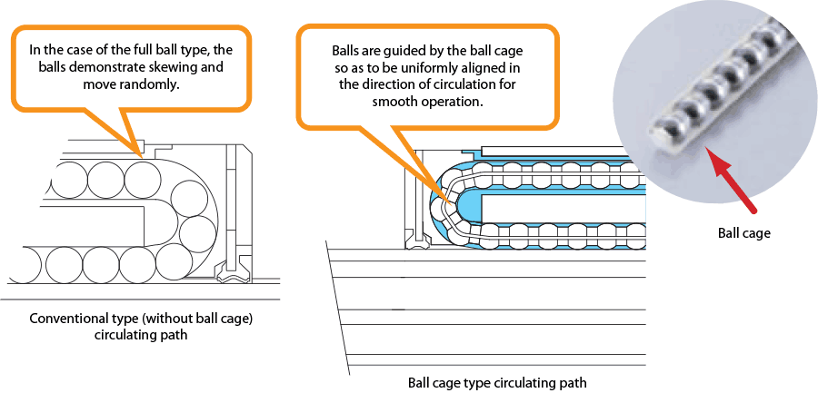 The Caged Ball technology has the benefit of an absence of collision noise between the balls for quiet operation. Furthermore, an orderly ball movement with accurate alignment of balls as well as stable movement due to the elimination of sudden variations in friction.